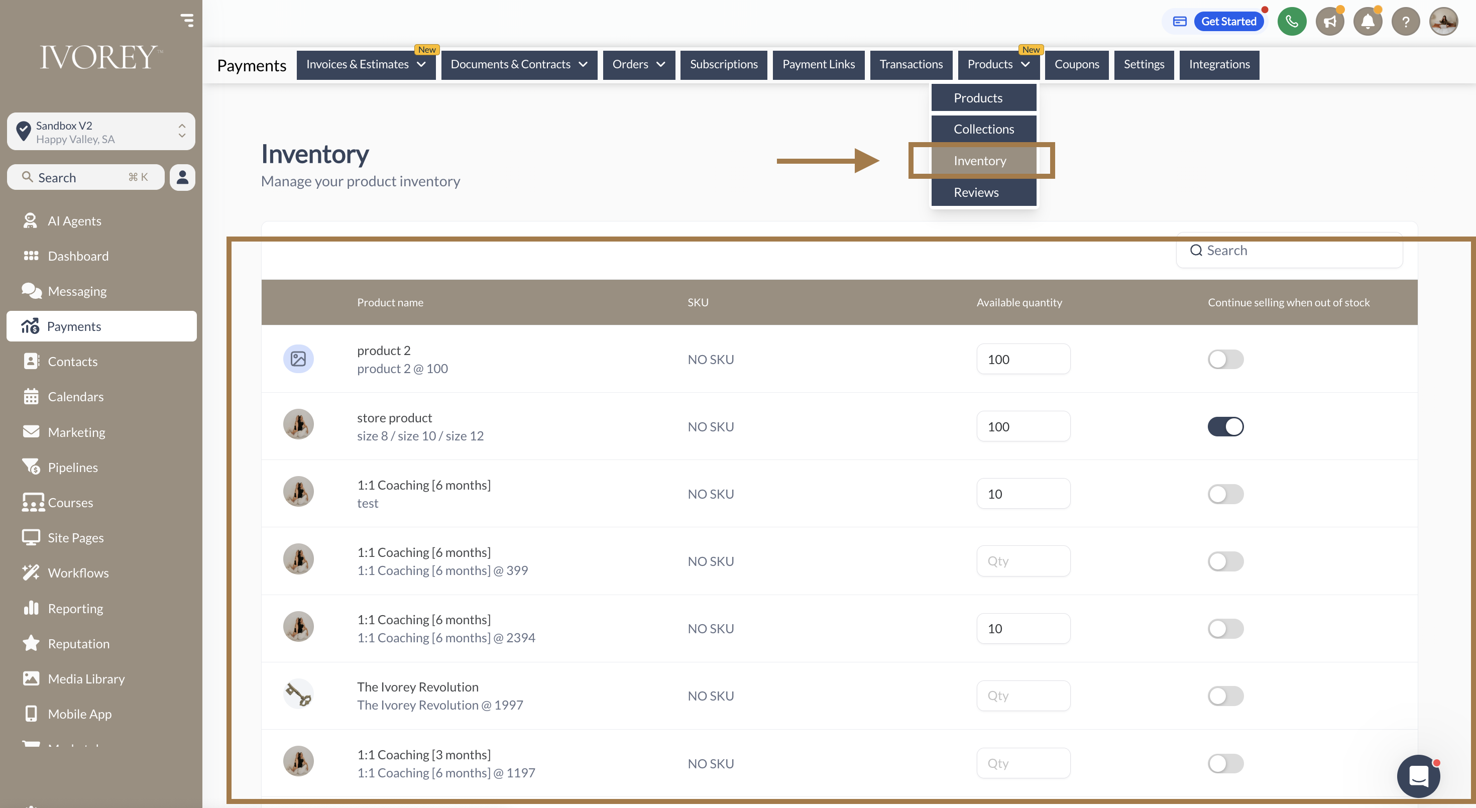 To see, track or manage your product inventory, go to [Payments] > along the top menu bar hover over [Payments] > then click [Inventory]