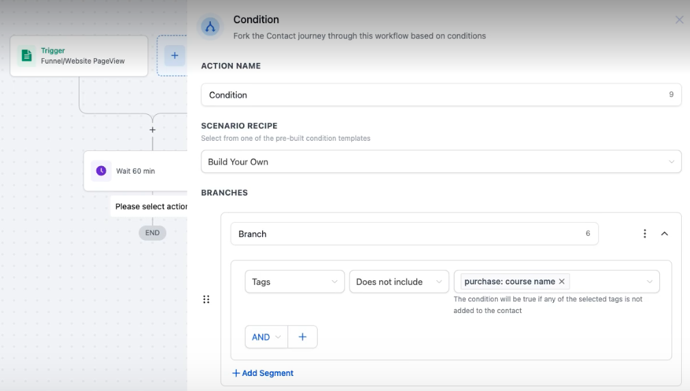 On the first branch, select [Contact Details] > [Tags] from the first drop-down menu > set the operator to [Does not include] > and select your purchase tag/s from the drop-down menu