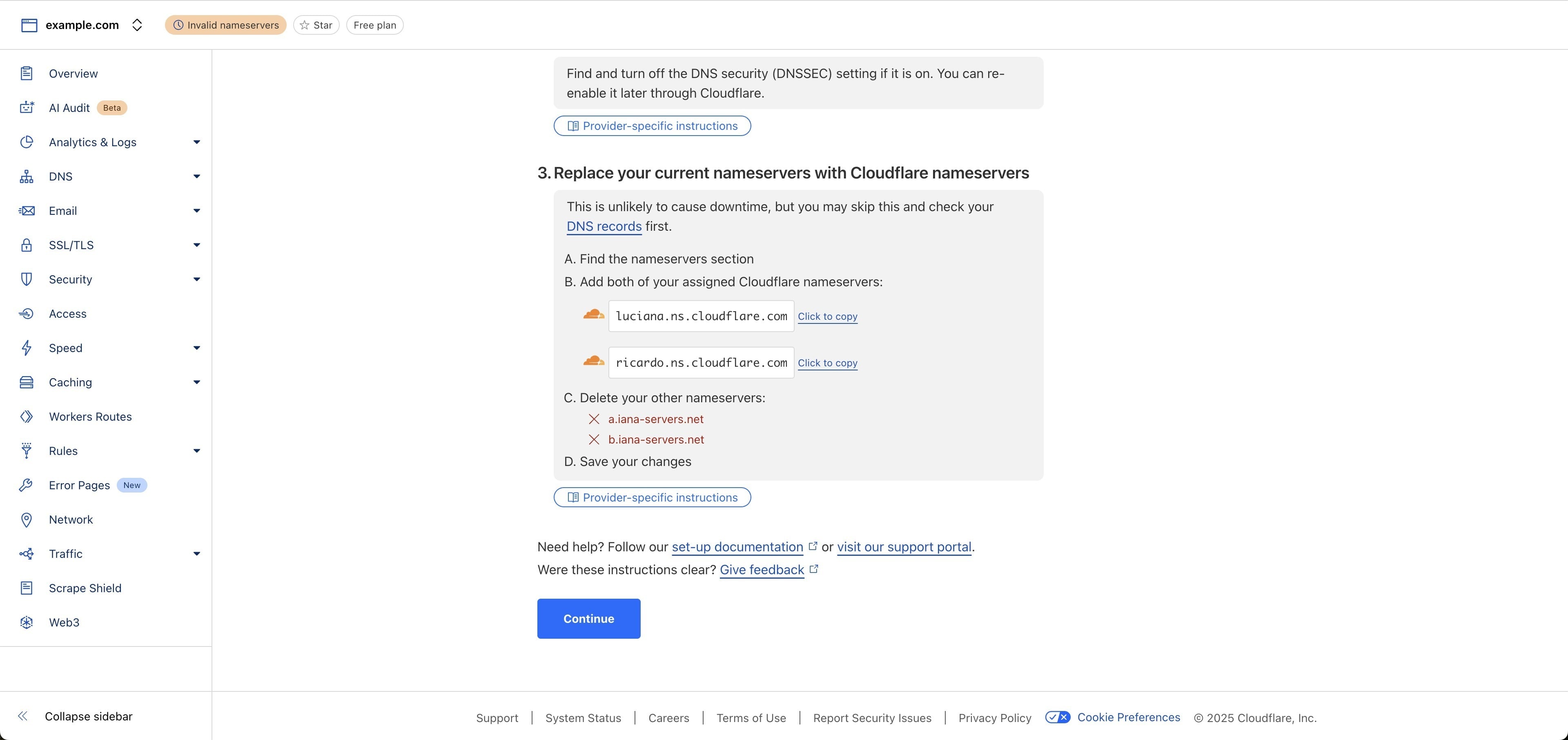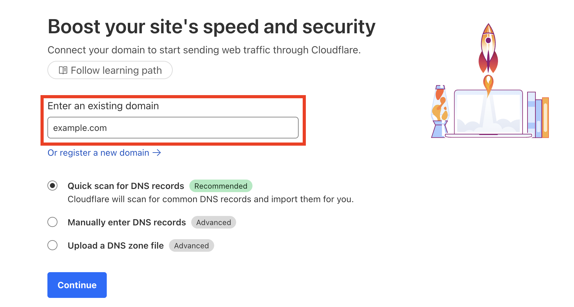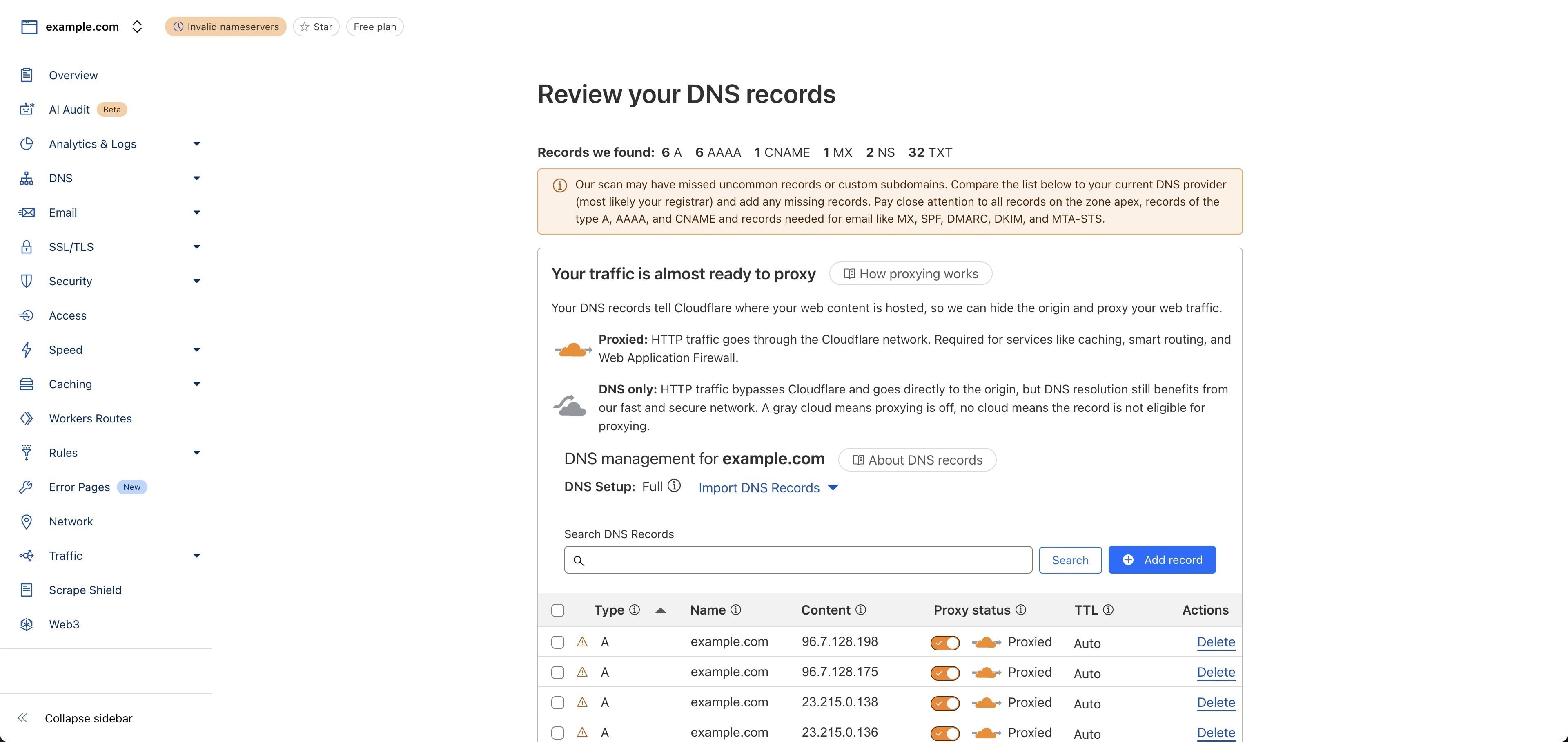 Cloudflare will scan your existing DNS records - review them carefully. You can find your current DNS records here: