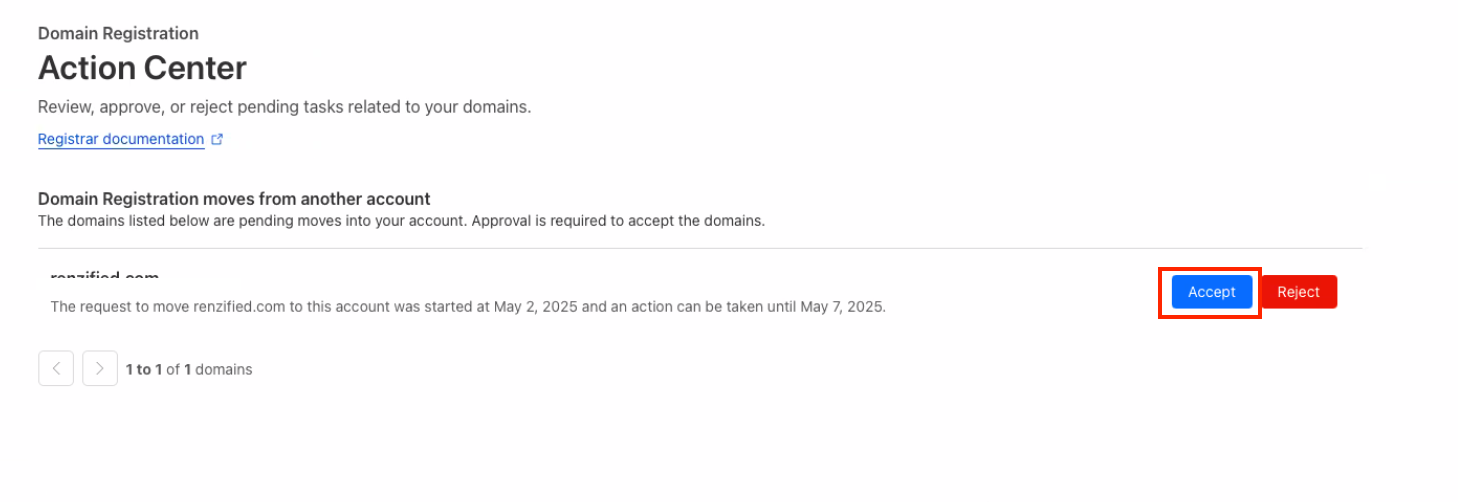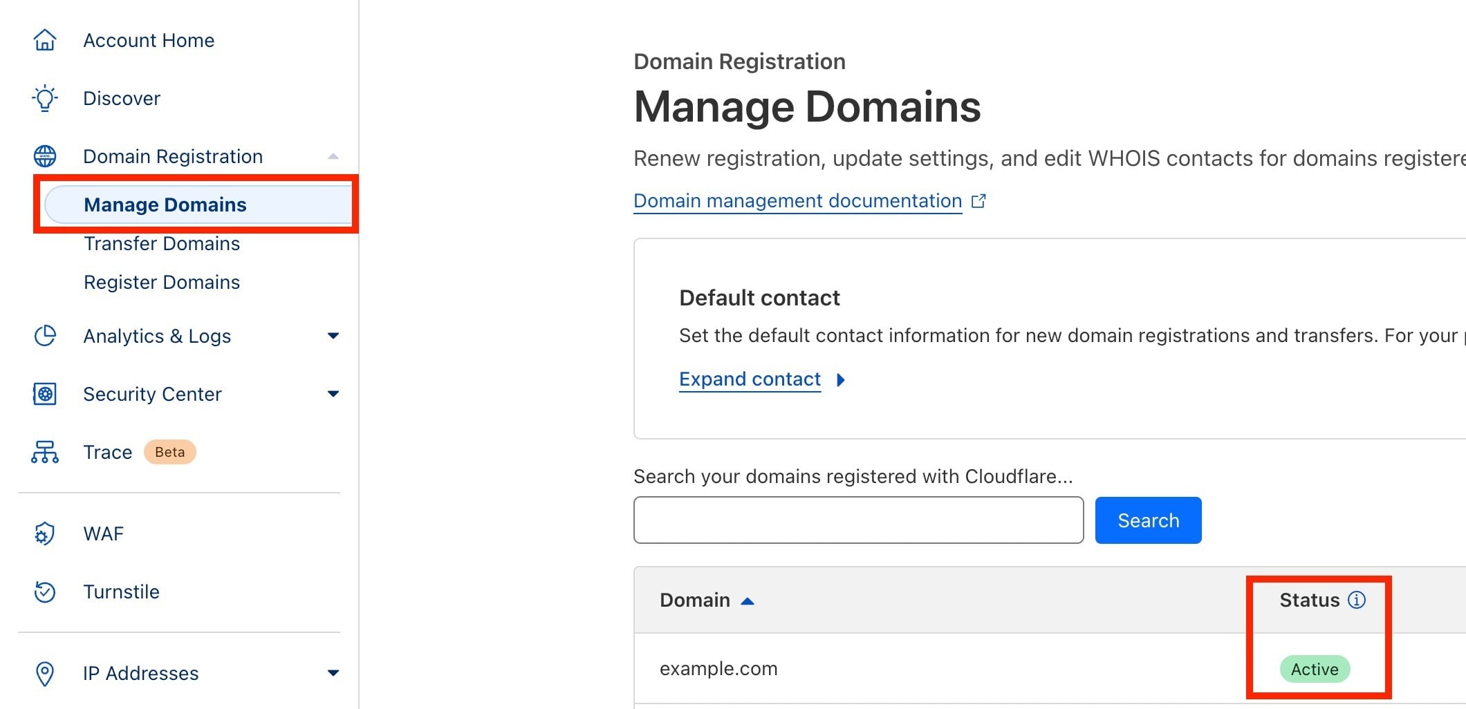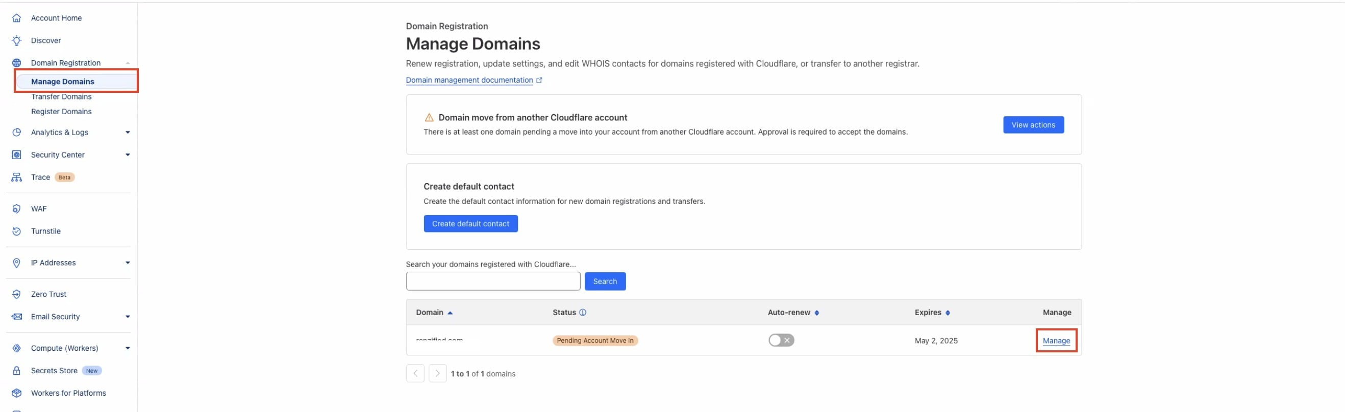 When the transfer is ready, log in to your Cloudflare account to accept it. Go to Domain Registration in the sidebar > and click [Manage Domains]