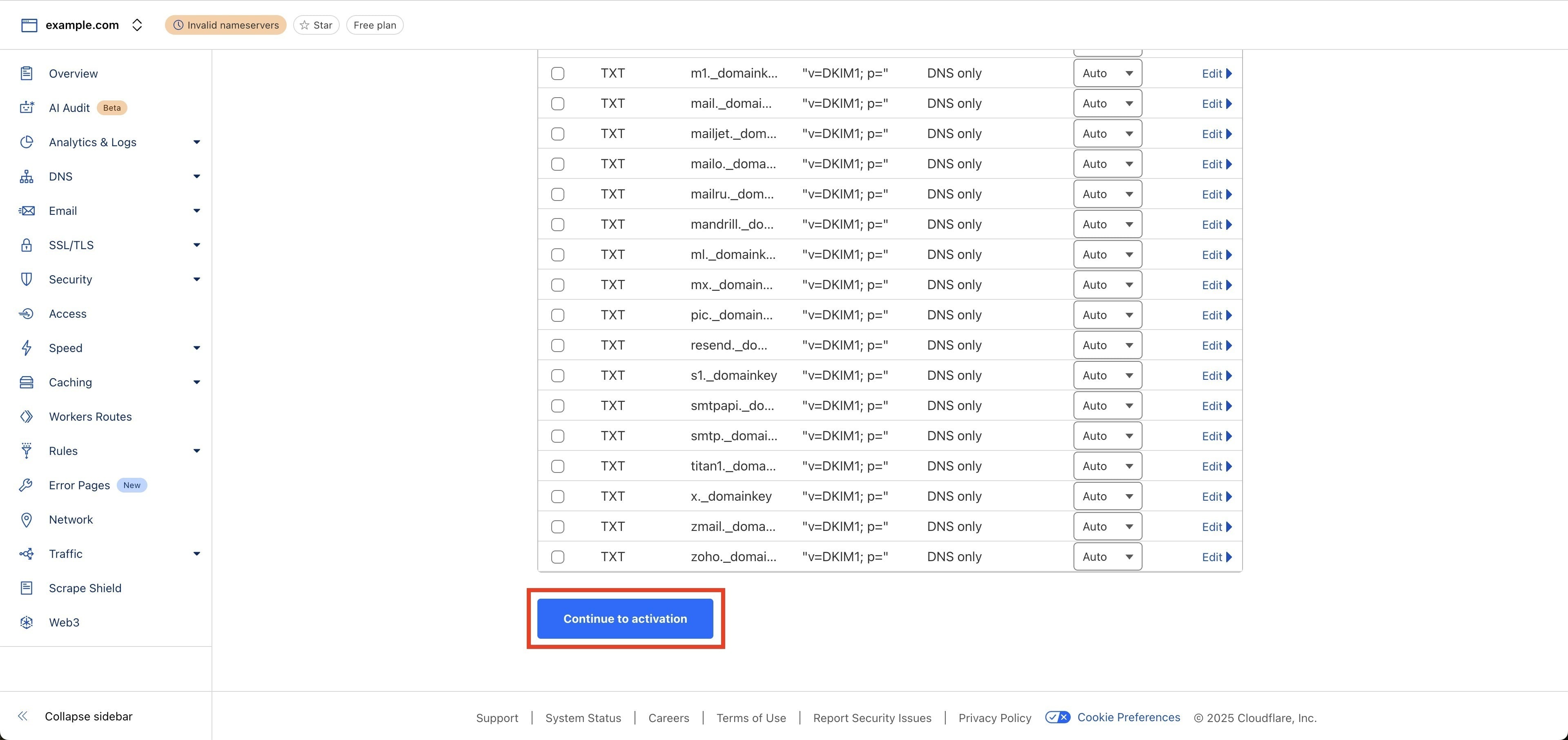 If all DNS records look correct, click [Continue to Activation]. If anything looks off, you can manually add, remove, or update records to match your current configuration