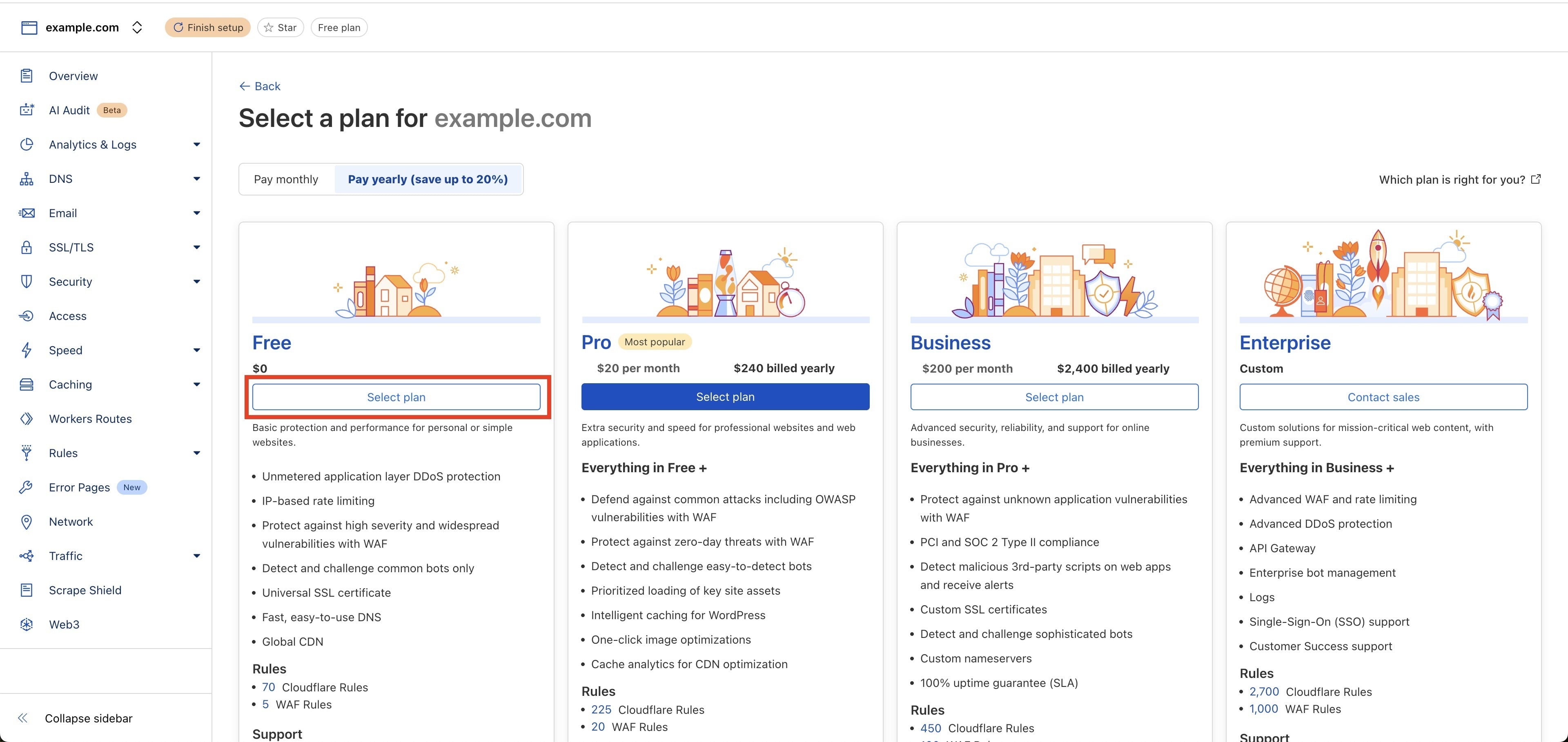 Choose a Cloudflare plan (the Free plan is totally fine for most users)