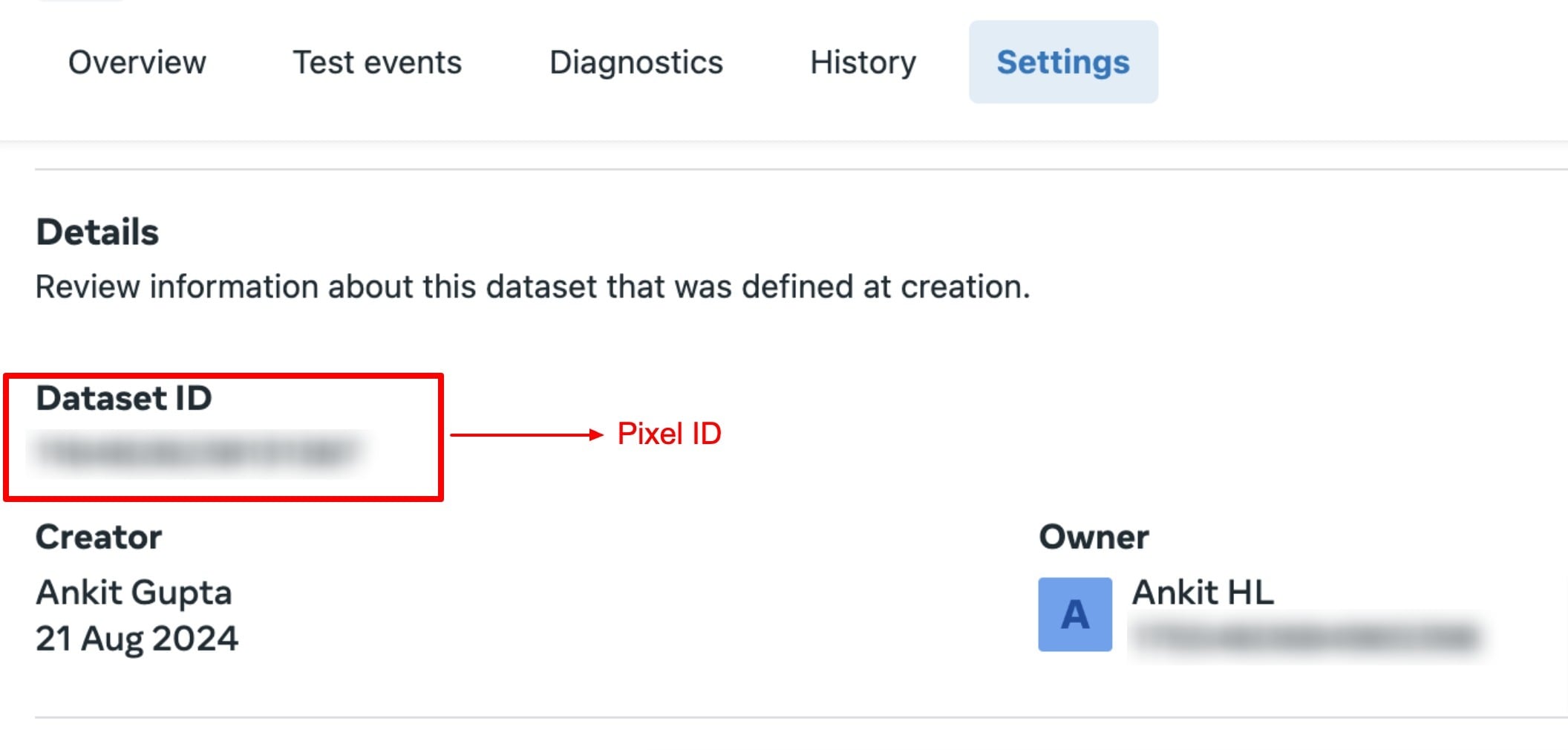 For the Pixel ID, head over to your Facebook Events Manager > Data Sources > Settings > Scroll down and copy your Dataset ID (this will be Pixel ID). Paste the Pixel ID in the Pixel ID field in your workflow