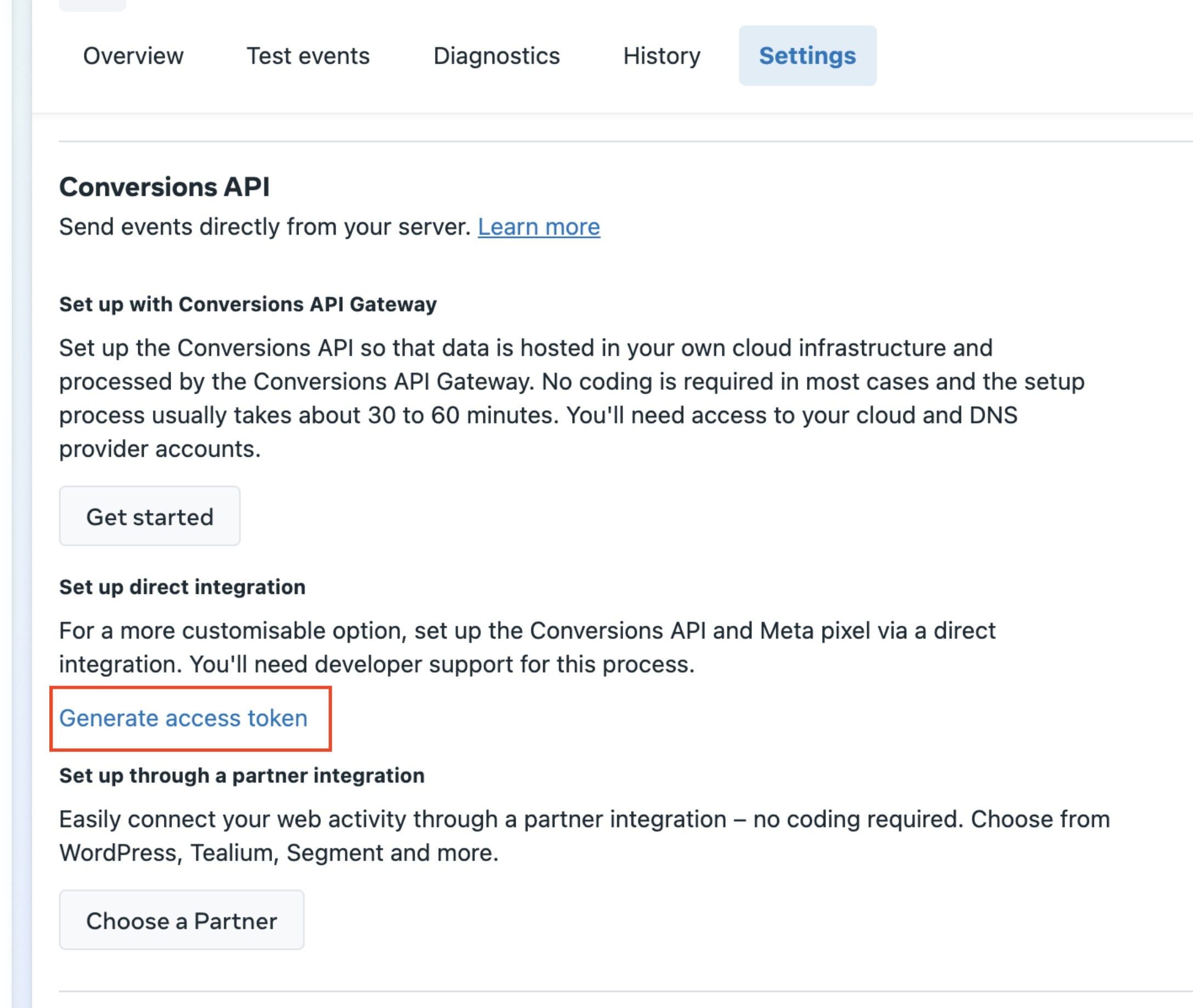 For the Access Token, head over to your Facebook Events Manager > [Data Sources] > [Settings] > Scroll down and click on [Generate Access Token]. After the access token is generated, copy it and paste it into the Access Token field in your workflow settings