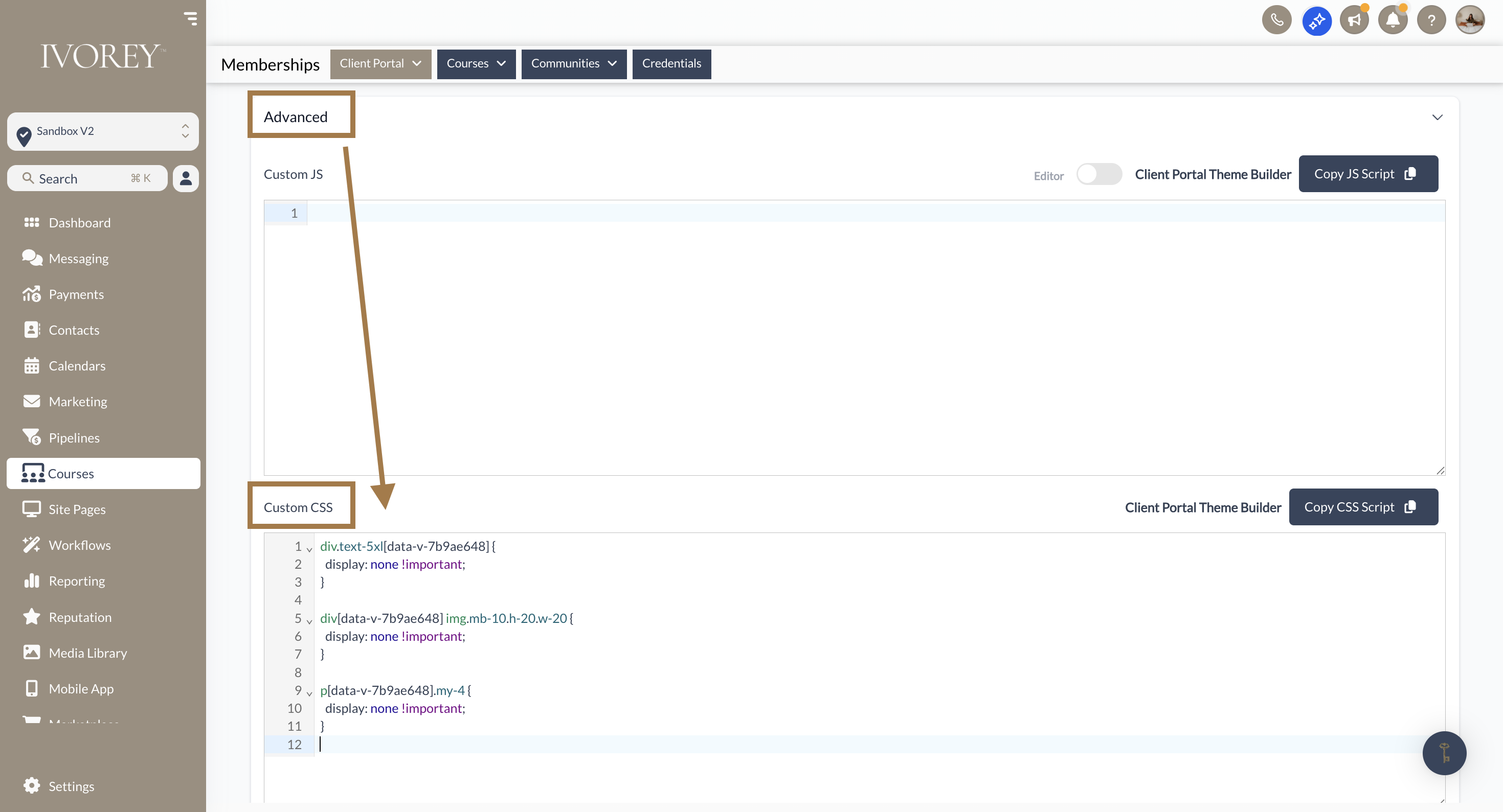 main menu, go to Courses > Client Portal > Settings > Branding > click the [Advanced] drop-down > and in the Custom CSS box, add the below code:
