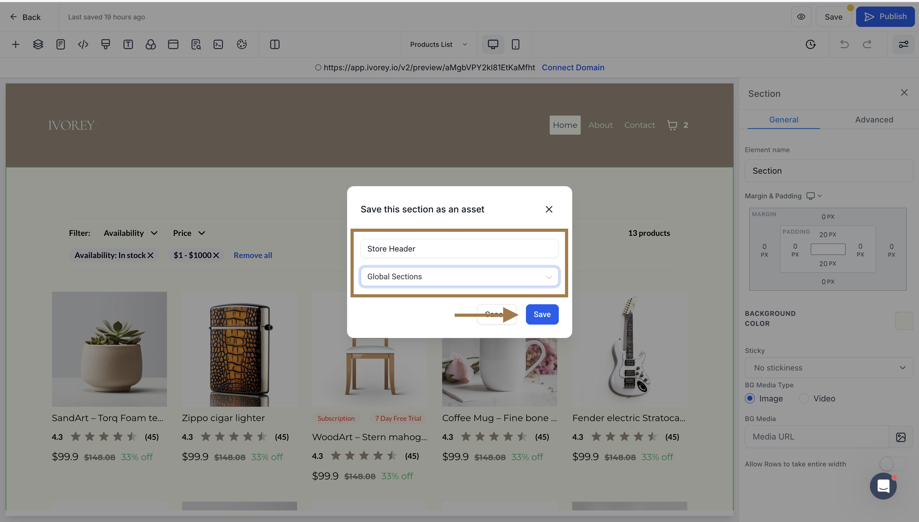 In the popup screen, name your section (e.g Store Header) > select 'Global Sections' from the dropdown menu > then click [Save]