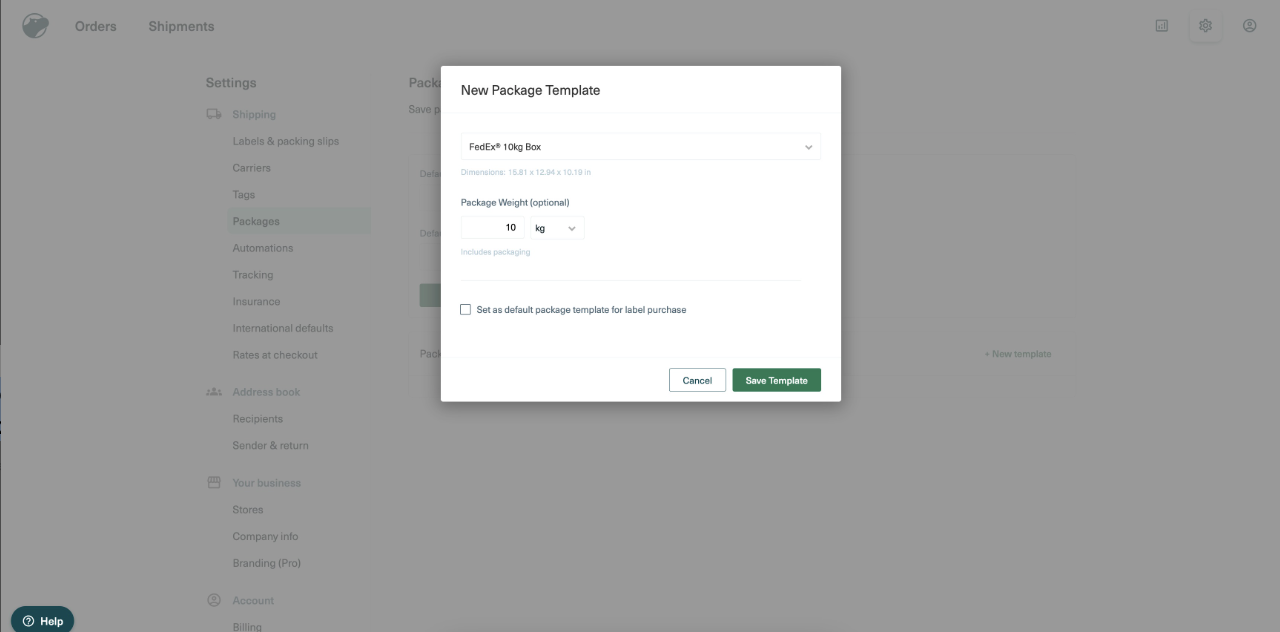 Here you'll set up the Sender Address, Packaging Template and the Weight