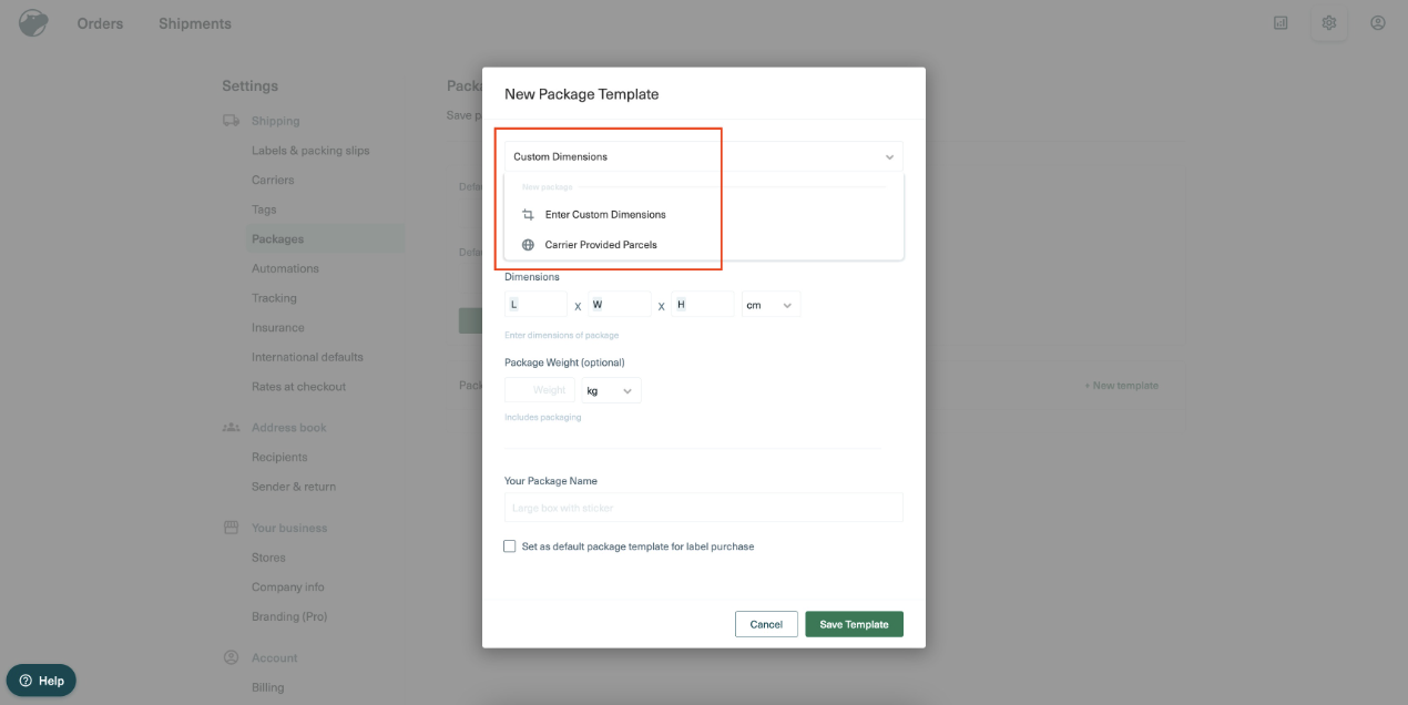 At the top click the [Custom Dimensions] dropdown menu. Store owners can either add a custom dimensions or choose a standard carrier provided parcel dimension: