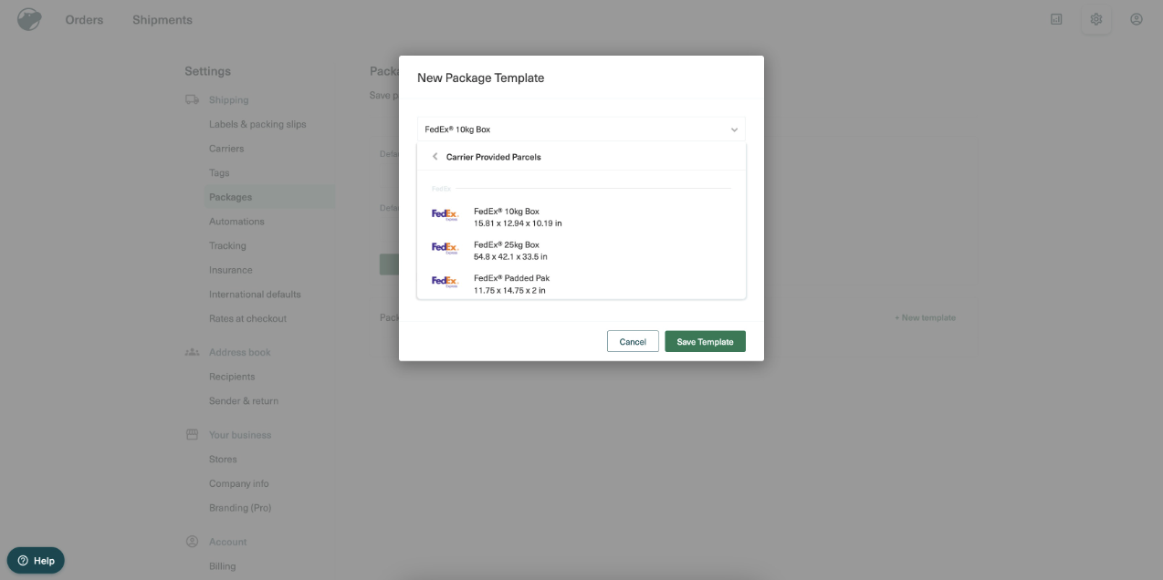 Below are the written steps to follow to set up the package template and shipping options in Shippo:
