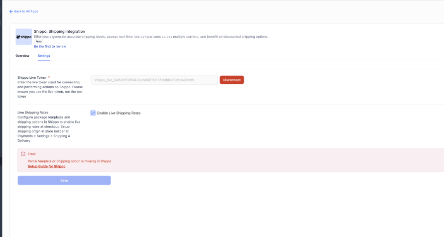 Note: If any information is missing from setting up package template, Shipping origin and Shipping options in Shippo, the following error will pop up: