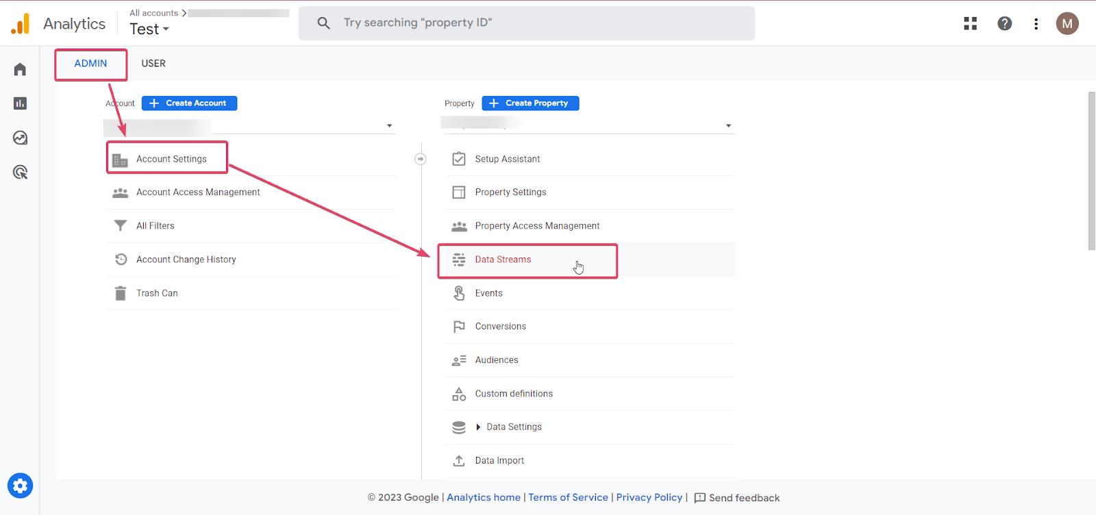 Log into your Google Analytics account > go to Admin > Account Settings > and under the Property column, click [Data streams]